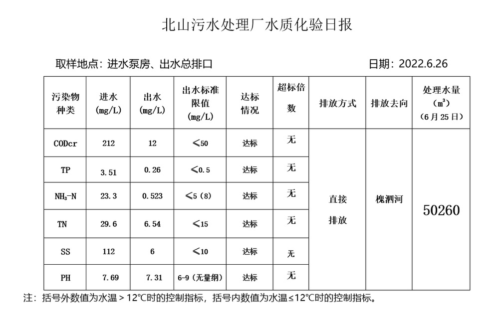 北山污水处理厂水质化验日报(2022.6.26)
