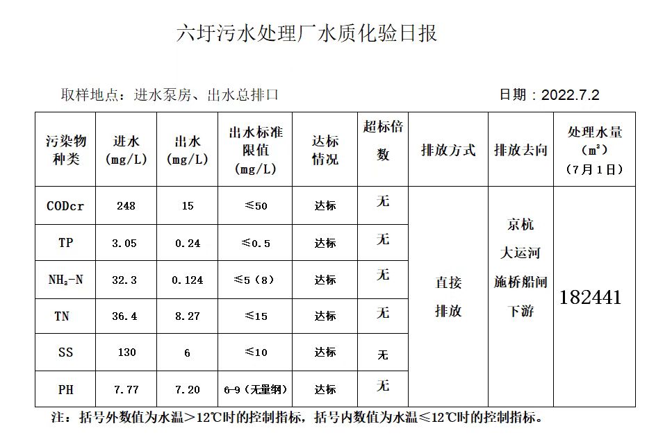 六圩污水处理厂水质化验日报(2022.7.2)