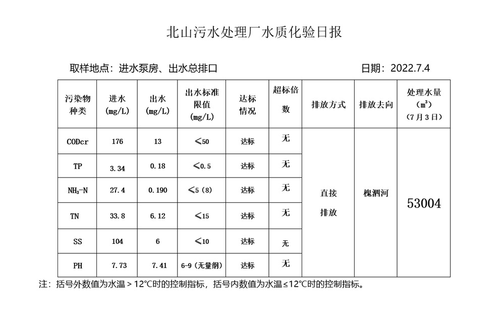 北山污水处理厂水质化验日报(2022.7.4)
