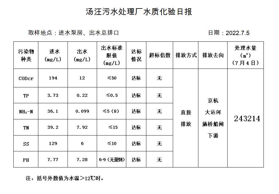 汤汪污水处理厂水质化验日报(2022.7.5)