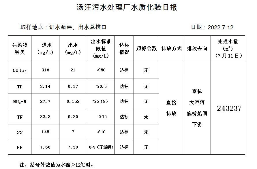 汤汪污水处理厂水质化验日报(2022.7.12)