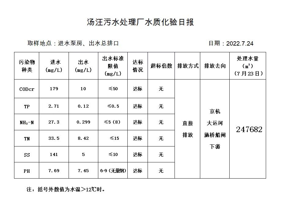 汤汪污水处理厂水质化验日报(2022.7.24)