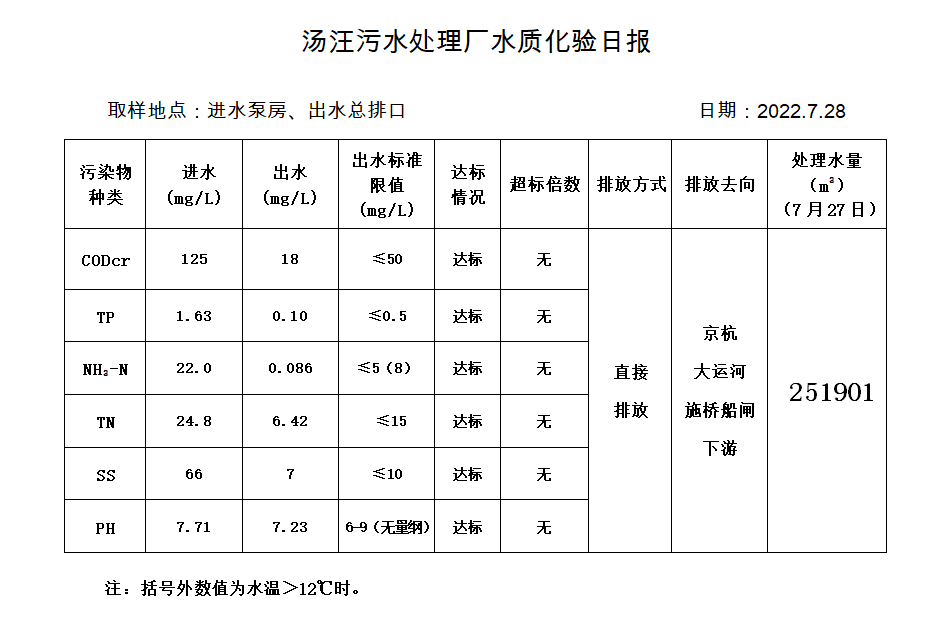 汤汪污水处理厂水质化验日报(2022.7.28)