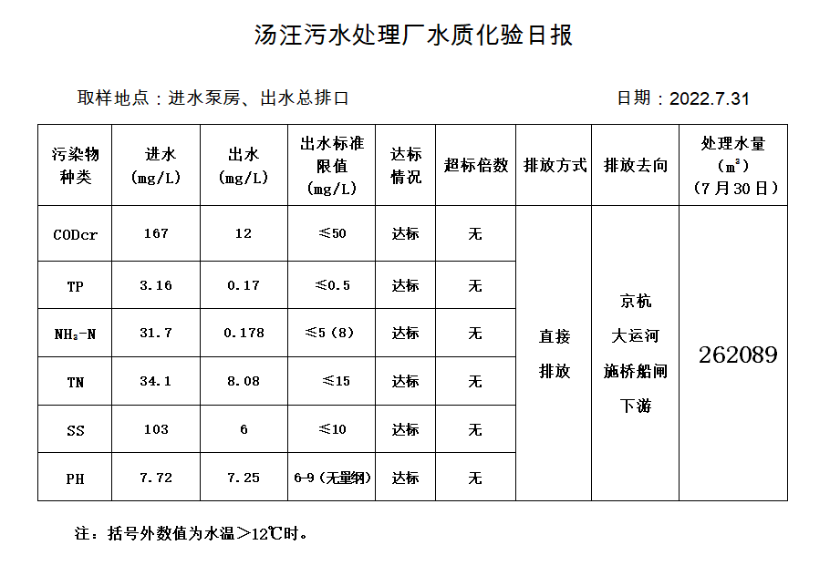 汤汪污水处理厂水质化验日报(2022.7.31)