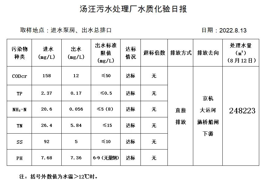 汤汪污水处理厂水质化验日报(2022.8.13)