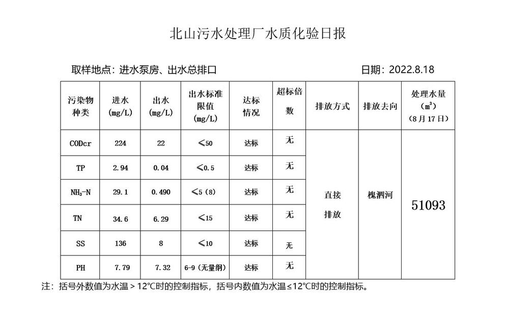 北山污水处理厂水质化验日报(2022.8.18)