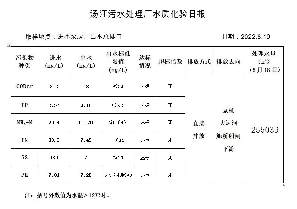 汤汪污水处理厂水质化验日报(2022.8.19)