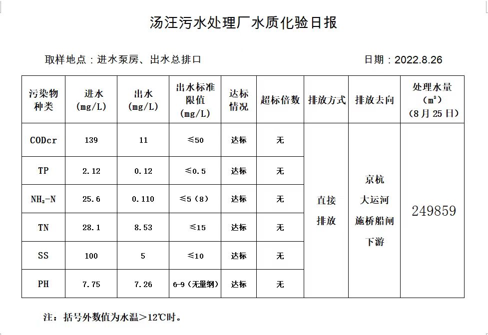 汤汪污水处理厂水质化验日报(2022.8.26)