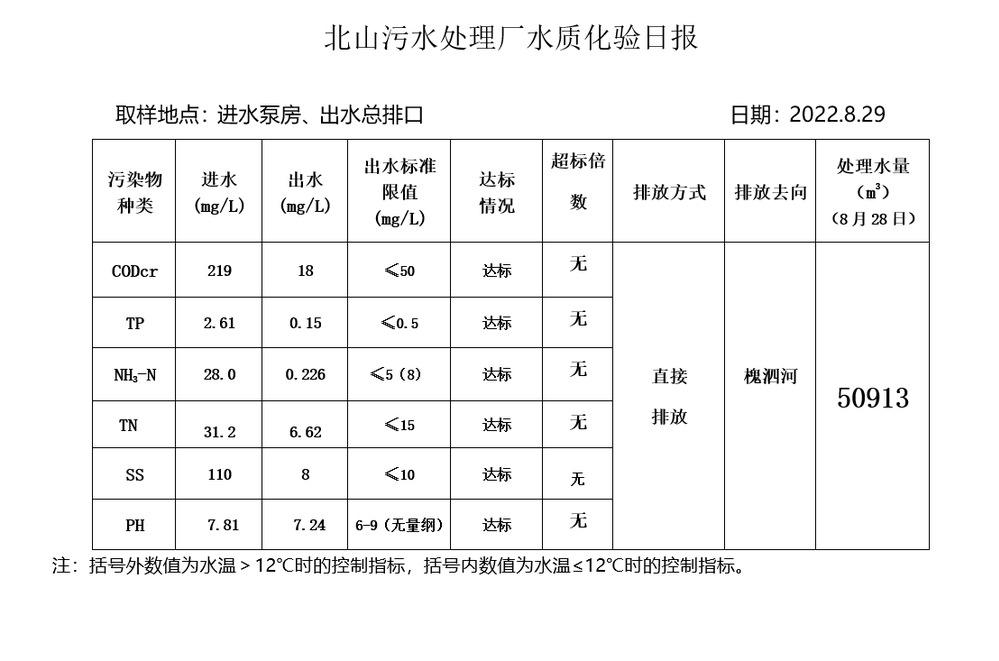 北山污水处理厂水质化验日报(2022.8.29)