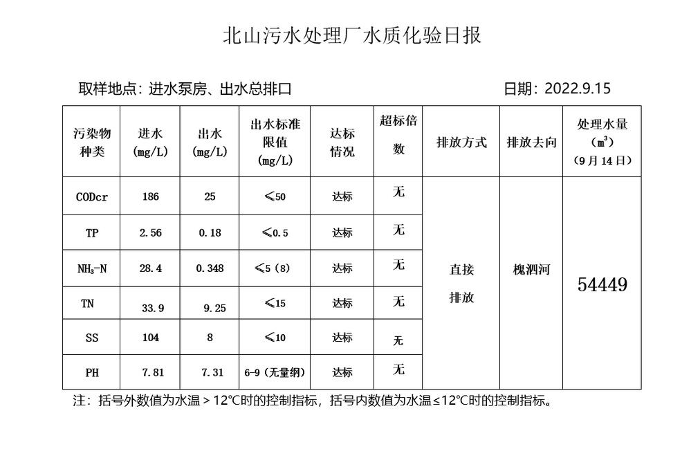 北山污水处理厂水质化验日报(2022.9.15)