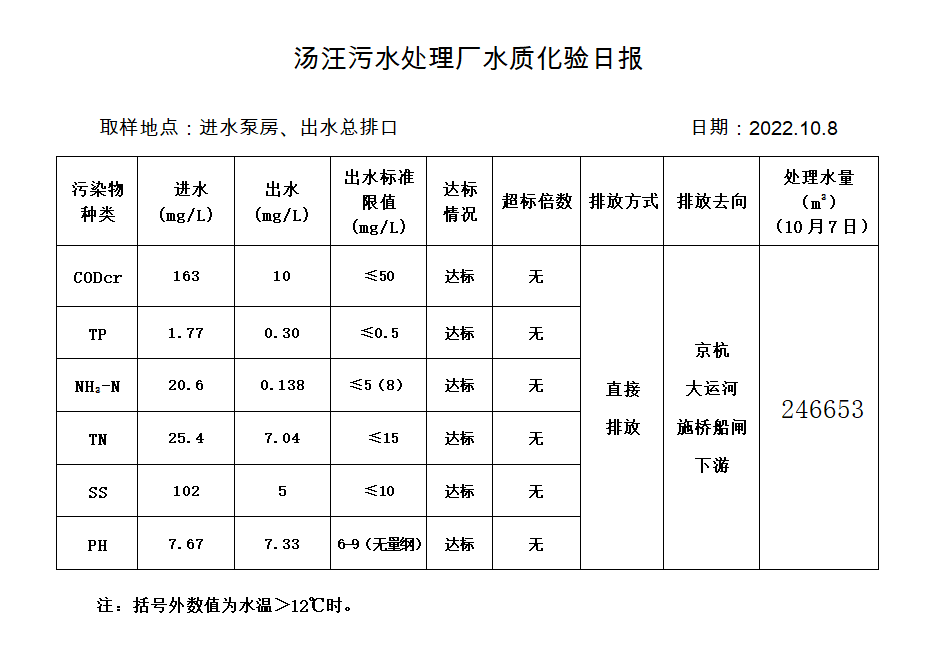 汤汪污水处理厂水质化验日报(2022.10.8)