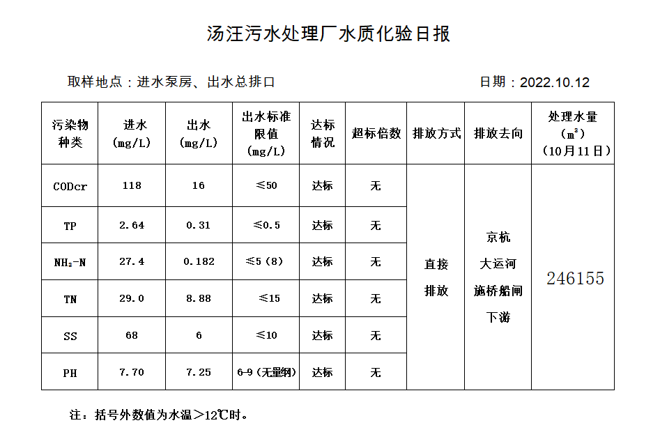 汤汪污水处理厂水质化验日报(2022.10.12)