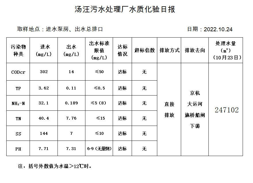 汤汪污水处理厂水质化验日报(2022.10.24)