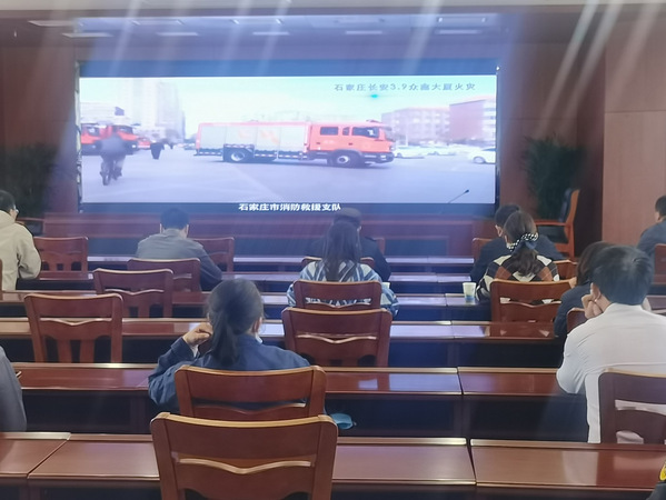 参加活动人员首先在五楼大会议室观看火灾事故警示教育片,随后开展消防安全知识培训,并现场通过消防警报系统,提醒所有参加人员有序进行撤离,在3分钟之内疏散到安全地点。