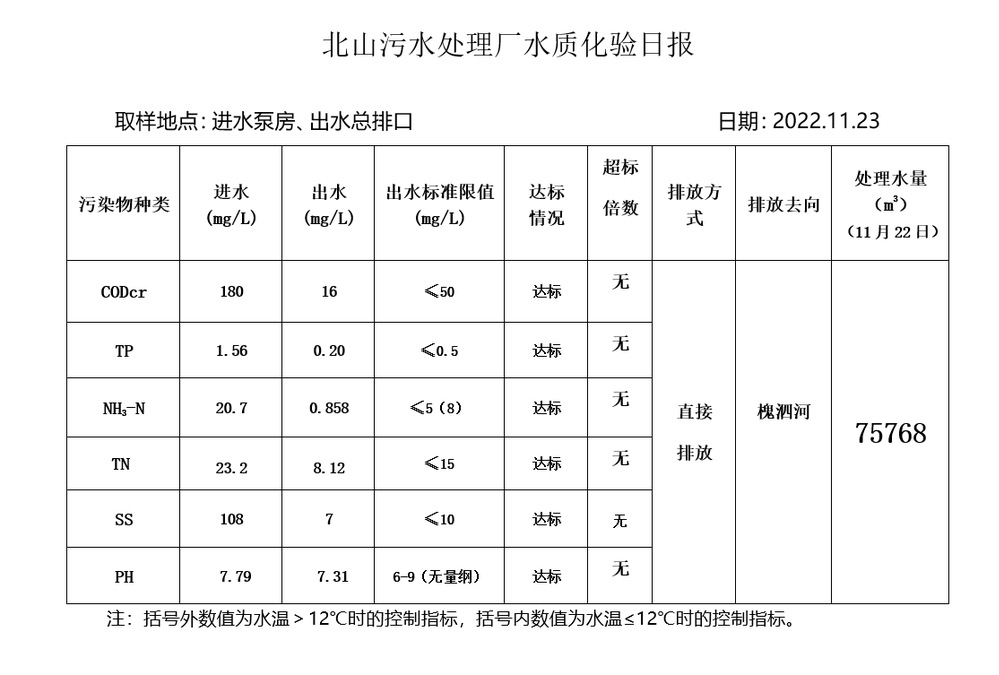 北山污水处理厂水质化验日报(2022.11.23)