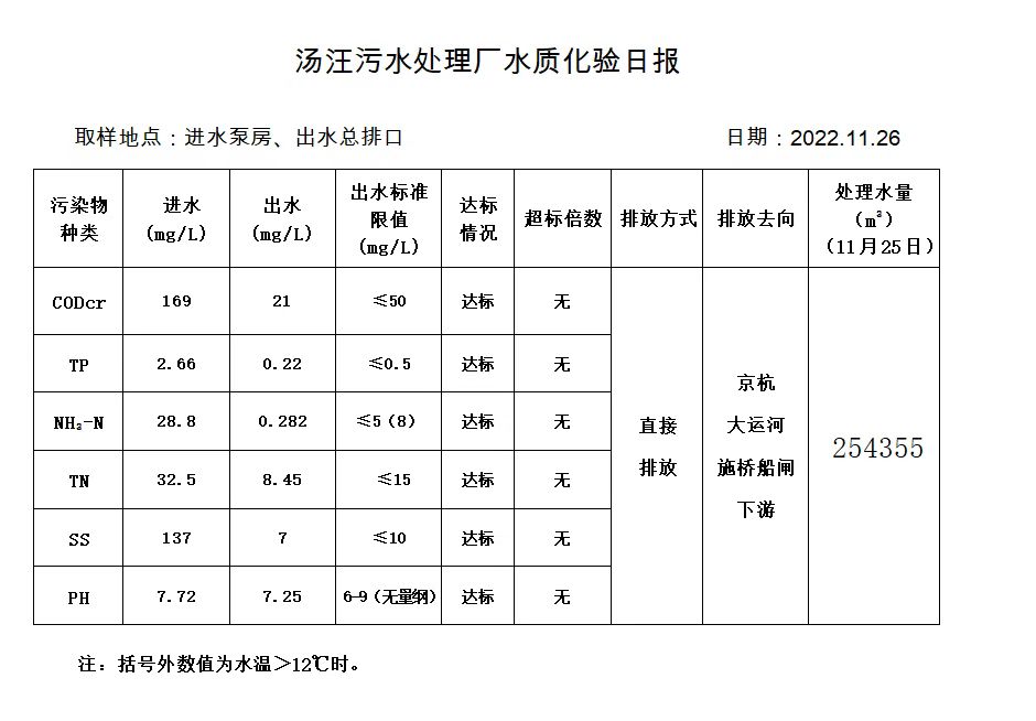 汤汪污水处理厂水质化验日报(2022.11.26)