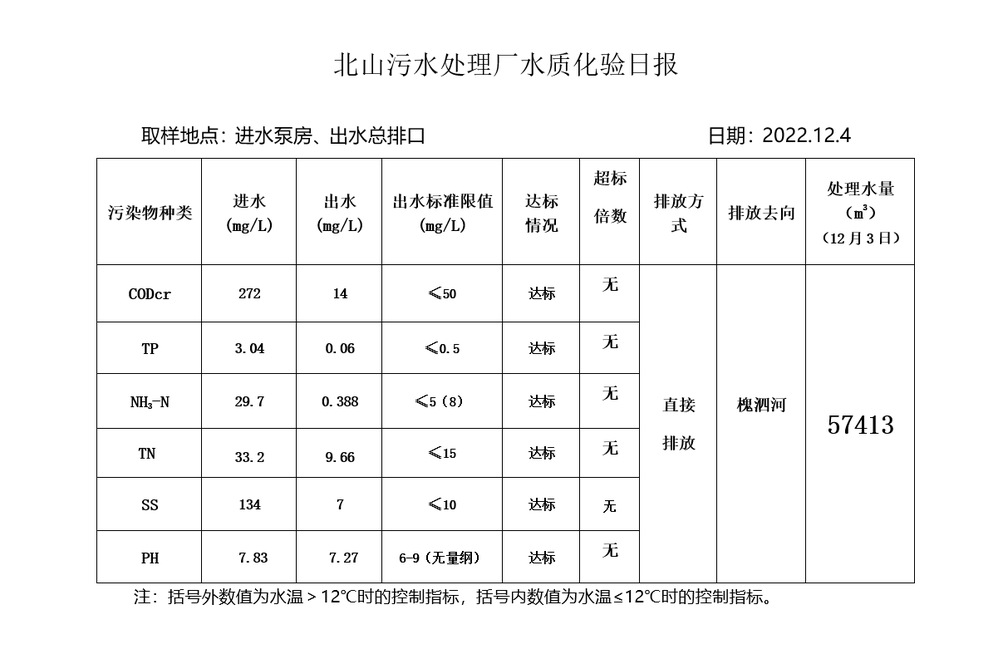 北山污水处理厂水质化验日报(2022.12.4)