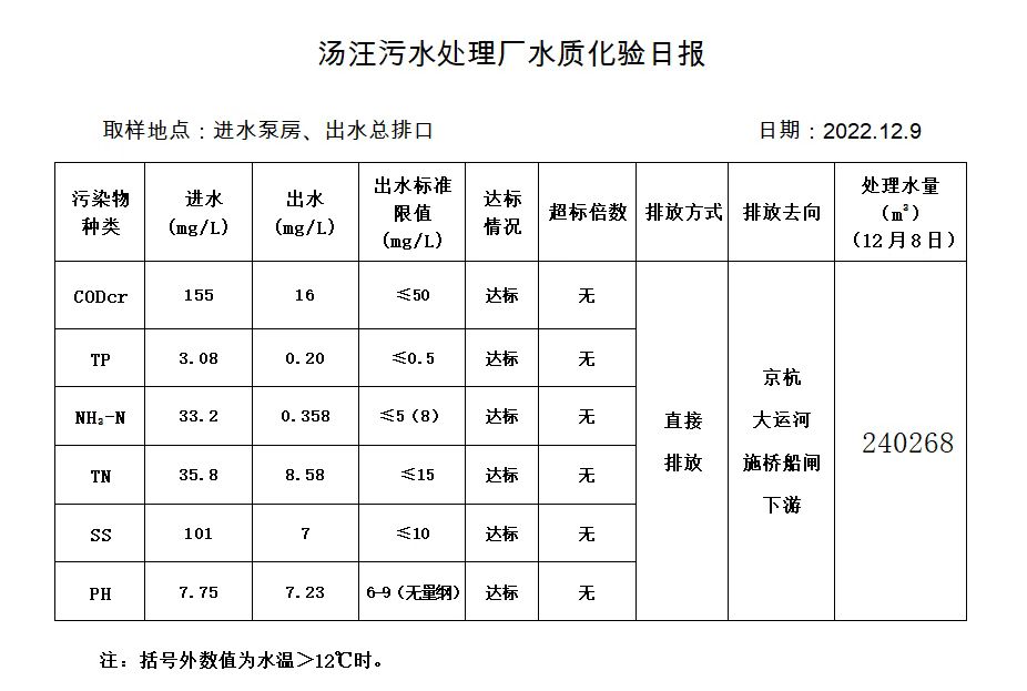 汤汪污水处理厂水质化验日报(2022.12.9)