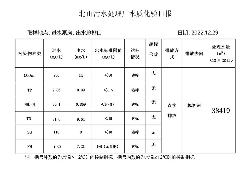 北山污水处理厂水质化验日报(2022.12.29)