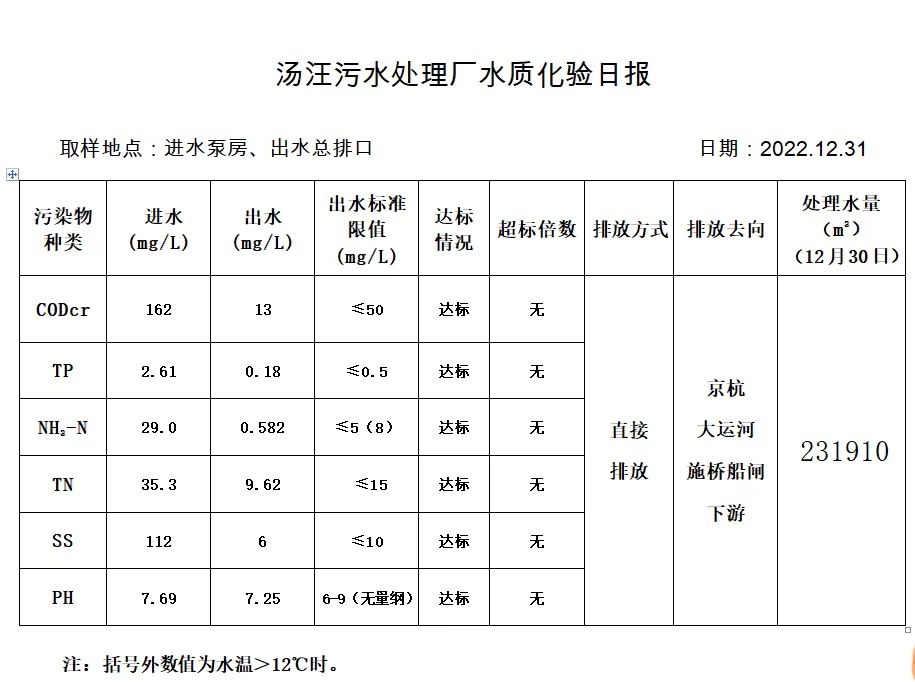 汤汪污水处理厂水质化验日报(2022.12.31)