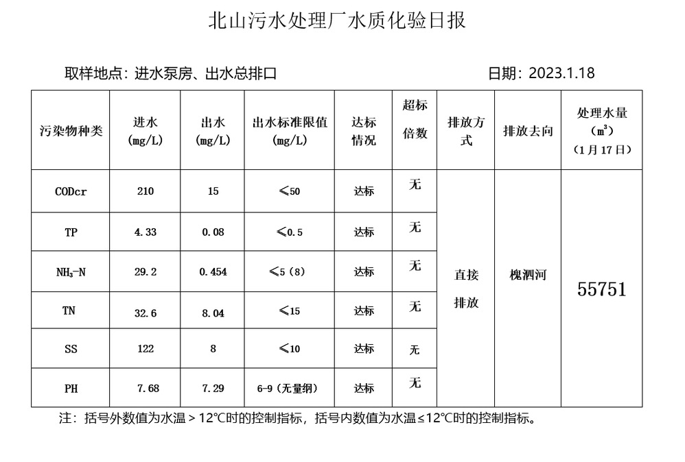 北山污水处理厂水质化验日报(2023.1.18)