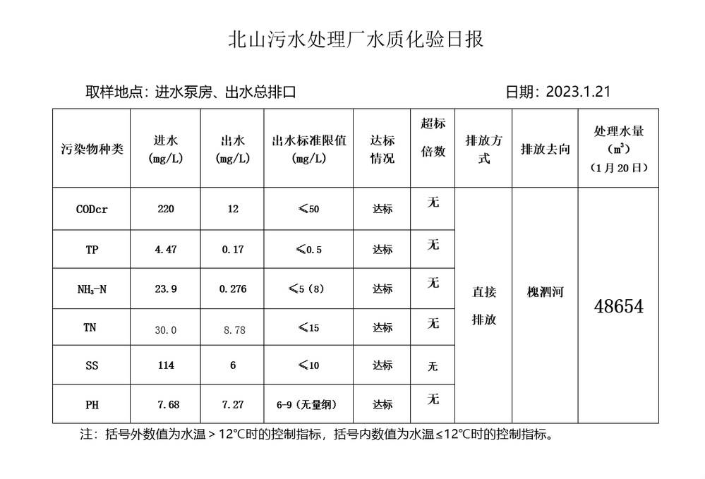 北山污水处理厂水质化验日报(2023.1.21)