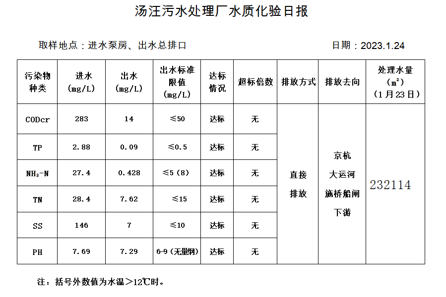 汤汪污水处理厂水质化验日报(2023.1.24)