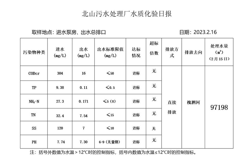 北山污水处理厂水质化验日报(2023.2.16)