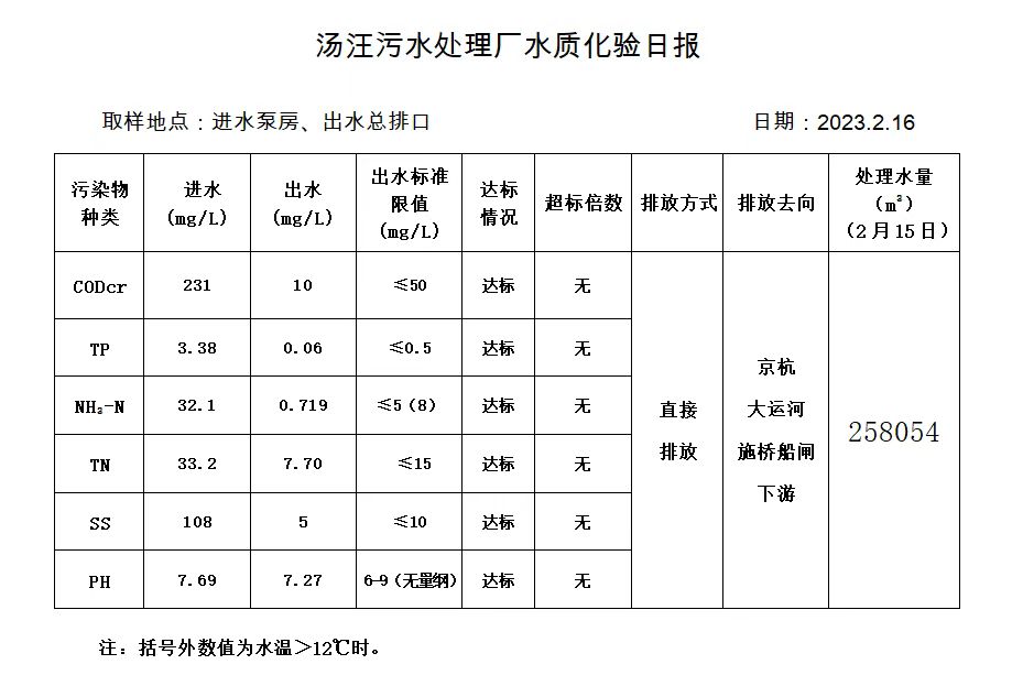 汤汪污水处理厂水质化验日报(2023.2.16)