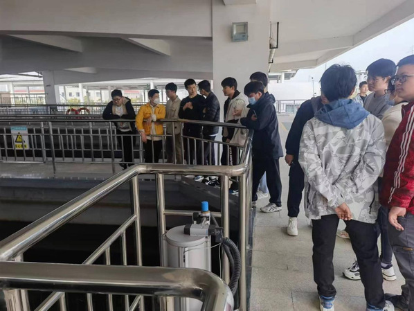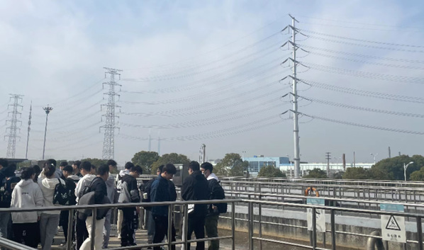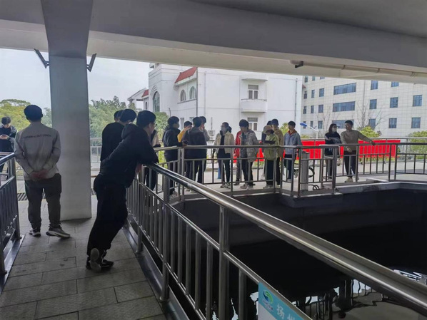 随后,同学们又来到六圩污水处理厂,工作人员向同学们介绍了厂区的基本情况,并带领他们参观了粗格栅、细格栅、旋流沉砂池等工艺处理单元。同学们走进污水处理的各个环节,循循渐进,近距离参观了解各个流程及处理效果。现场气氛活跃,学生代表与工作人员进行了交流和互动,工作人员都进行了深入浅出的解答,取得了良好的参观效果。