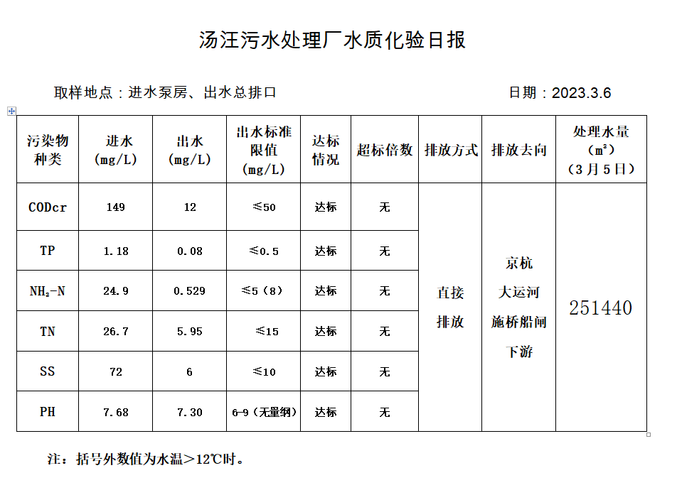 汤汪污水处理厂水质化验日报(2023.3.6)