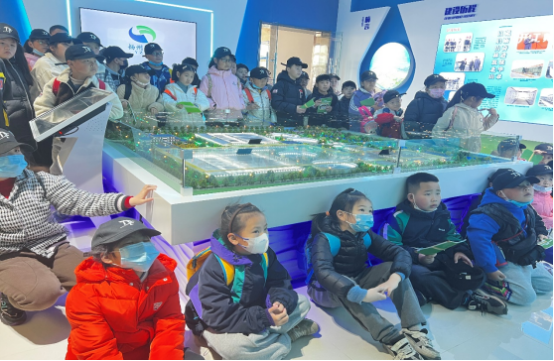 在环保综合展厅内,工作人员首先播放了污水处理动画讲解视频,帮助小朋友们对污水处理流程有了初步了解。紧接着,讲解人员以沙盘模型为可视化载体,向小朋友们生动讲解了厂内主要的构筑物和设备原理。讲解期间,小朋友们对污水过程充满了好奇,纷纷化身“十万个为什么”,现场讲解人员耐心为他们答疑解惑,寓教于乐的讲解方式使得现场研学氛围浓厚热烈。
