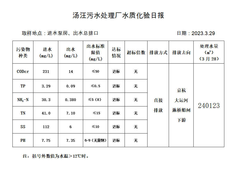 汤汪污水处理厂水质化验日报(2023.3.29)