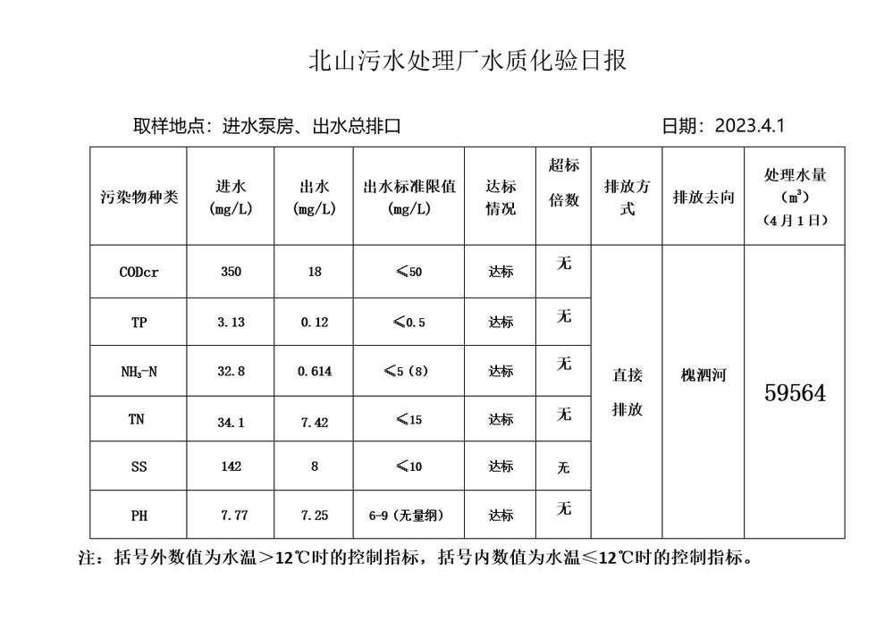 北山污水处理厂水质化验日报(2023.4.1)