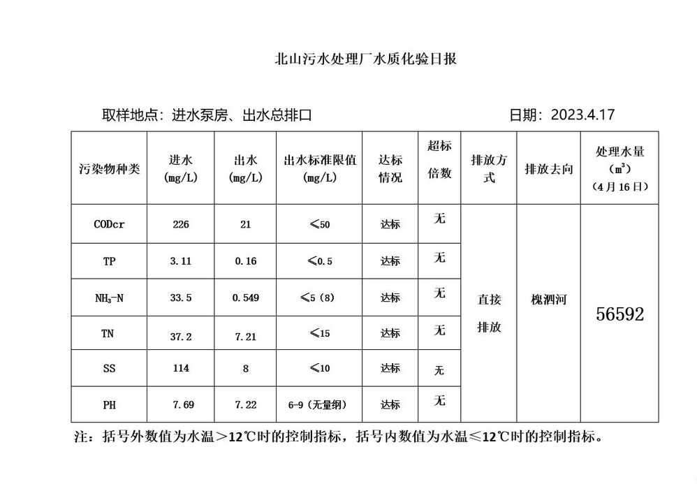 北山污水处理厂水质化验日报(2023.4.17)