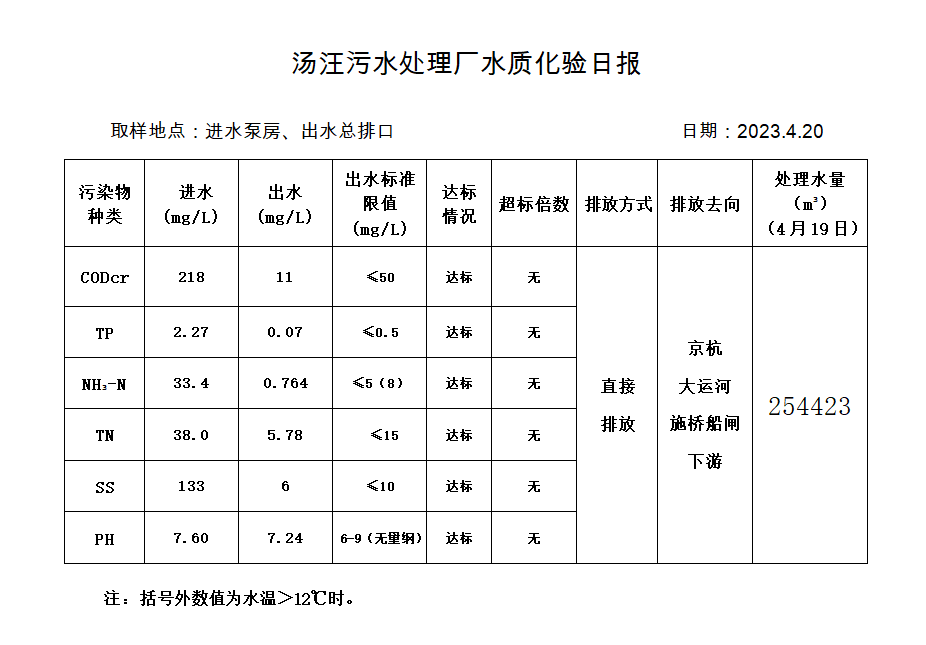 汤汪污水处理厂水质化验日报(2023.4.20)
