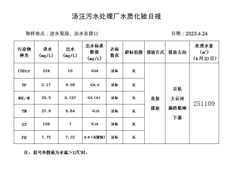 汤汪污水处理厂水质化验日报(2023.4.24)