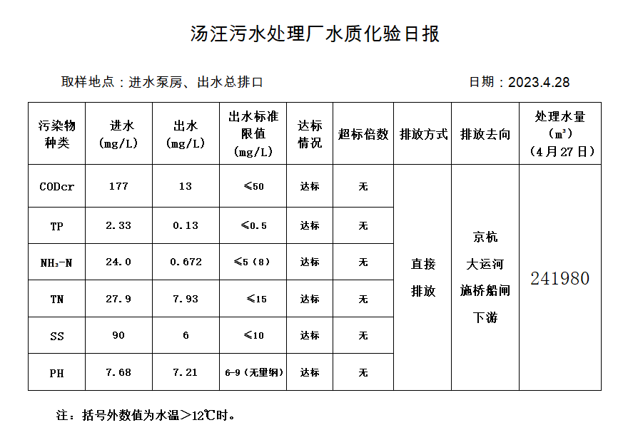 汤汪污水处理厂水质化验日报(2023.4.28)