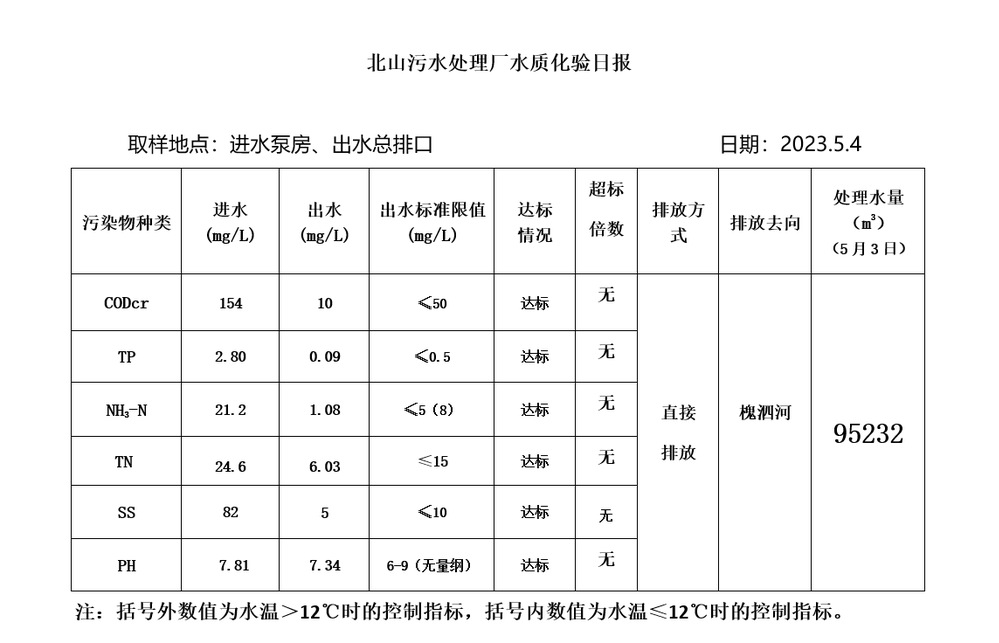 北山污水处理厂水质化验日报(2023.5.4)