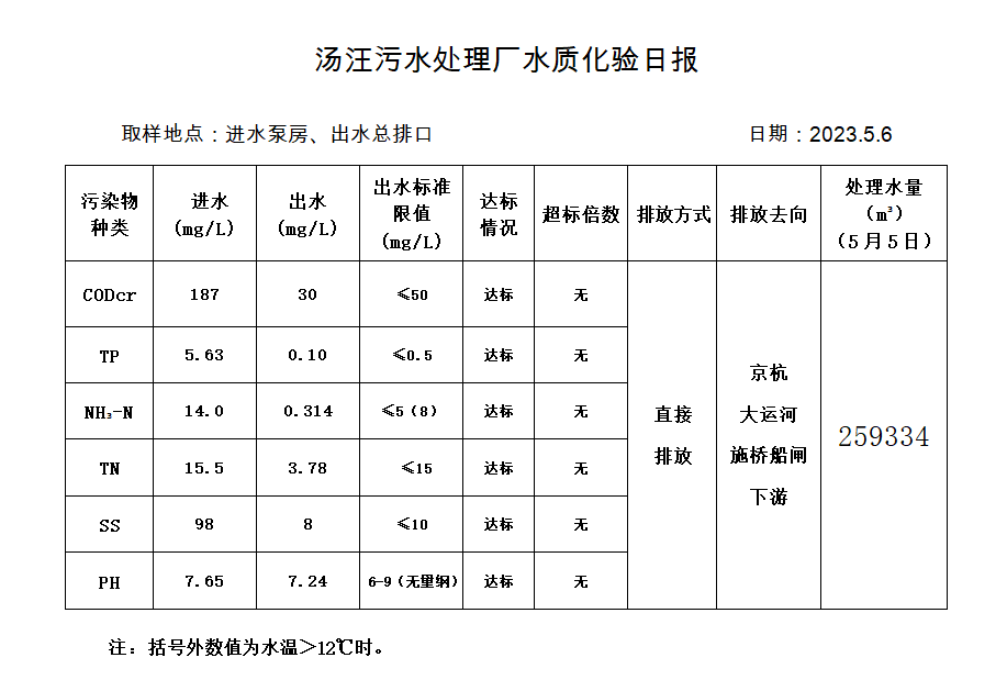 汤汪污水处理厂水质化验日报(2023.5.6)