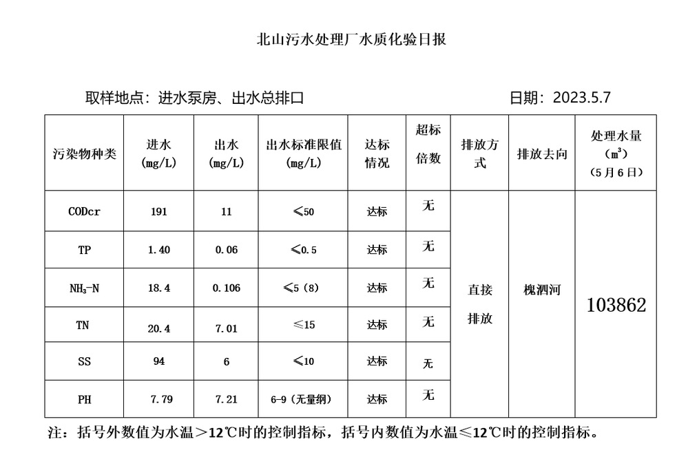 北山污水处理厂水质化验日报(2023.5.7)