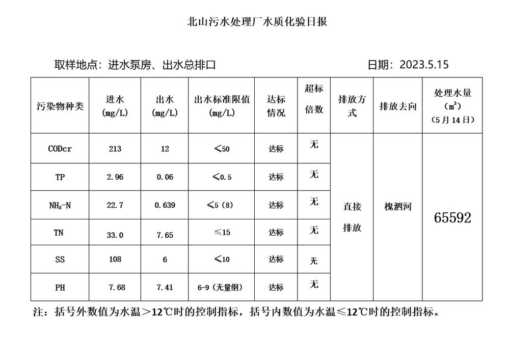 北山污水处理厂水质化验日报(2023.5.15)
