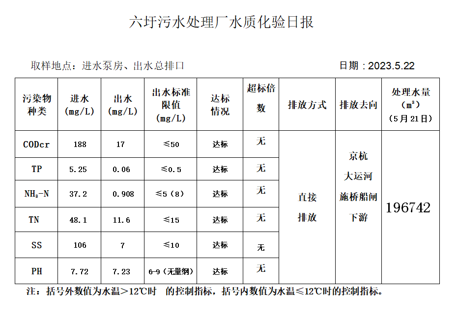 六圩污水处理厂水质化验日报(2023.5.22)