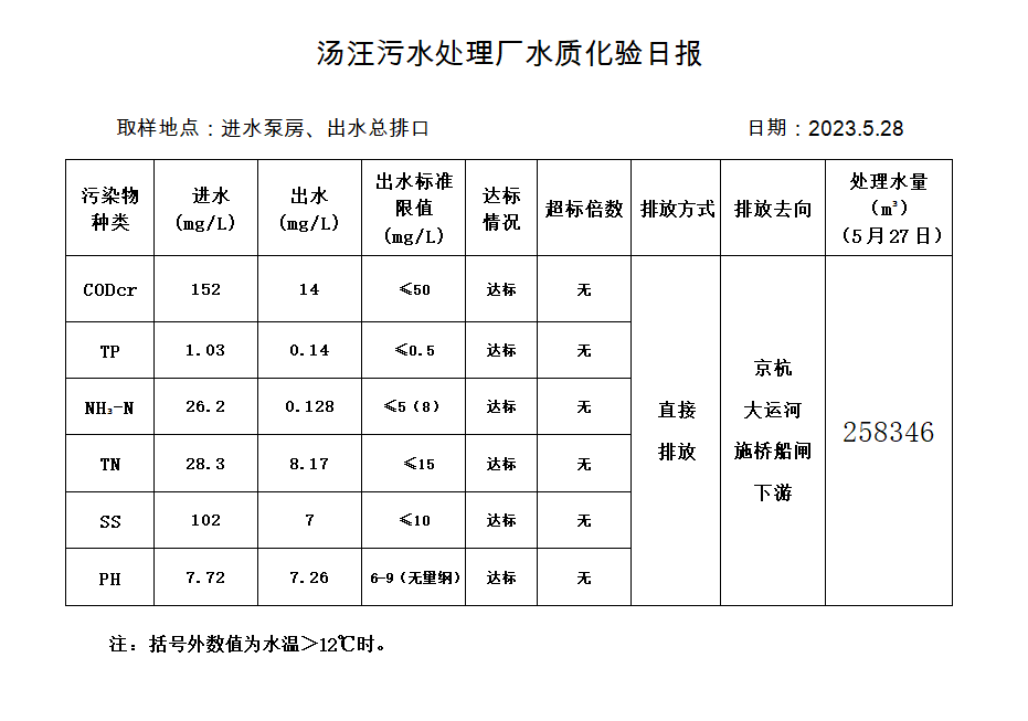汤汪污水处理厂水质化验日报(2023.5.28)