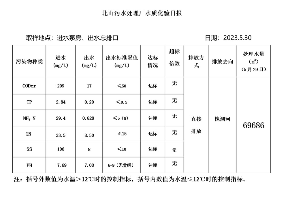 北山污水处理厂水质化验日报(2023.5.30)