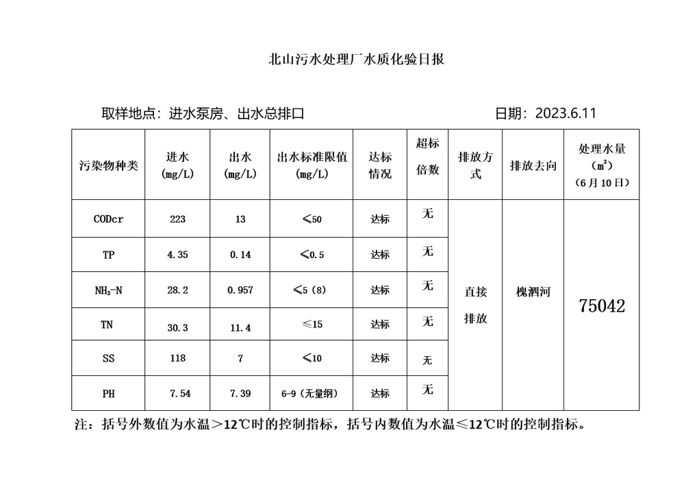 北山污水处理厂水质化验日报(2023.6.11)