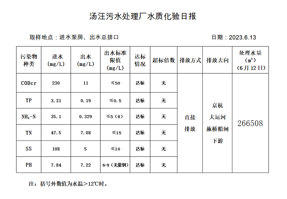 汤汪污水处理厂水质化验日报(2023.6.13)
