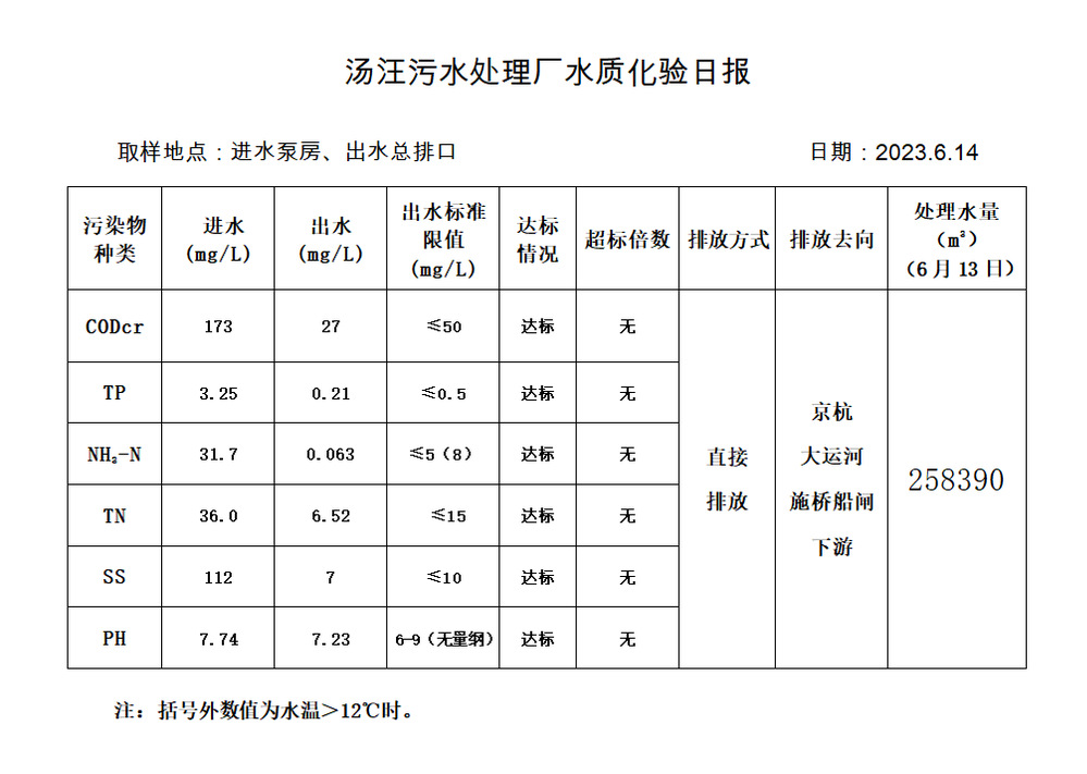 汤汪污水处理厂水质化验日报(2023.6.14)