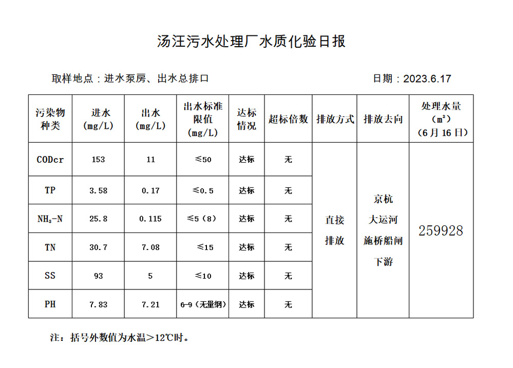 汤汪污水处理厂水质化验日报(2023.6.17)