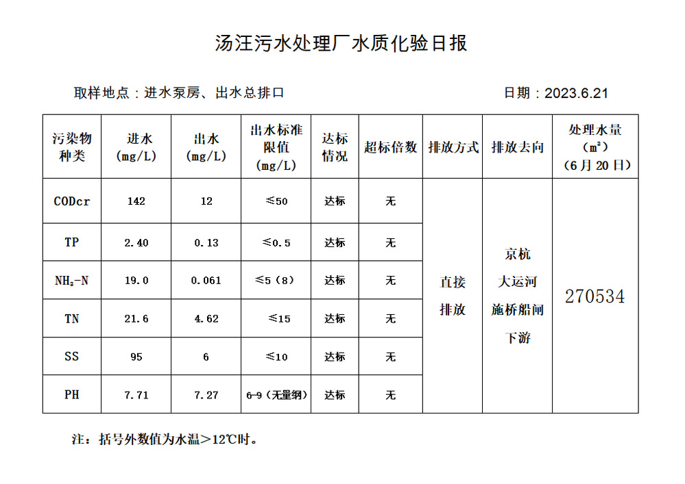 汤汪污水处理厂水质化验日报(2023.6.21)